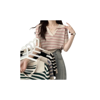 เสื้อไหมพรมแขนสั้นคอปกซีทรูใส่สบายระบายดีมากสวยงาม เสื้อครอปถัก เสื้อลายทาง See through Striped Knitted Sweater H337