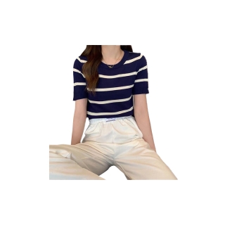 Bonnie(พร้อมส่ง/ใหม่)#รุ่น1585เสื้อยืดแขนสั้นผู้หญิงแฟชั่นเสื้อไหมพรมคอกลมลายทางสไตล์เกาหลี